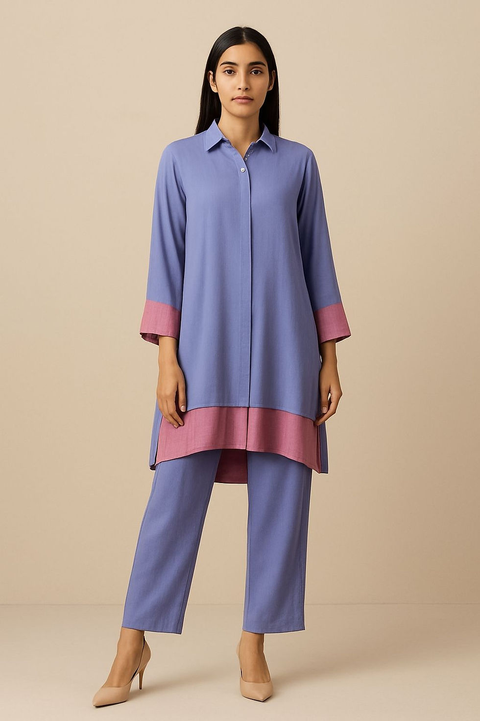 This elegant co-ord set is crafted in luxurious Cotton Silk, offering a soft sheen and breathable comfort for effortless all-day wear. Designed in refreshing hues of Aqua Green, Pink, and Yellow, each piece is elevated with intricate multi-thread embroidery that adds depth, texture, and artisanal charm. The regular fit ensures a flattering yet comfortable silhouette, making it perfect for festive brunches, daytime celebrations, or intimate gatherings.